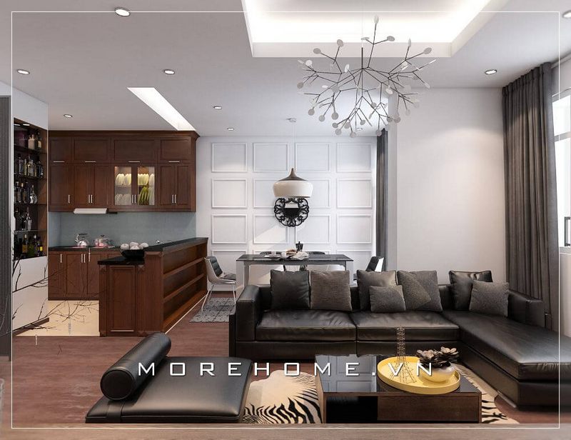Không gian phòng bếp của chung cư được thiết kế theo phong cách hiện đại, nội thất gỗ tự nhiên với màu nâu tinh tế, ấm áp và sang trọng.