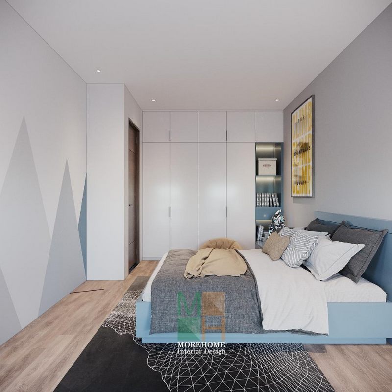 Mẫu giấy dán tường trắng với họa tiết độc đáo làm nên sự đẹp cho phòng ngủ của căn hộ chung cư.